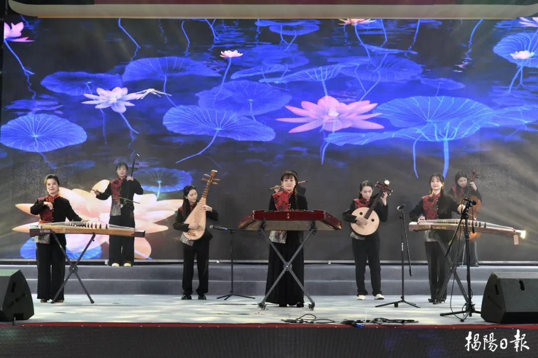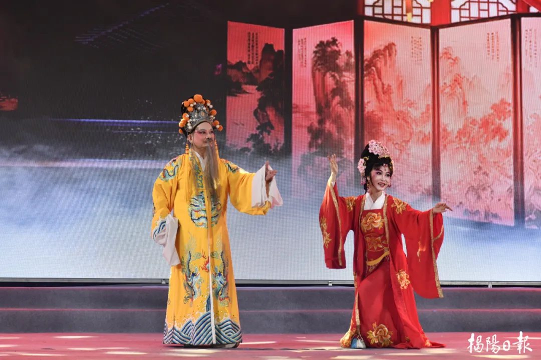 移步學宮文化廣場,「月滿古城潮韻華章」國家級非物質文化遺產代表性項目——潮劇精品惠民展演正在進行,精彩的傳統潮劇唱段讓戲臺前人潮滾滾,觀眾熱情高漲,現場座無虛席,四周都站滿了人,揭陽市潮劇傳承保護中心的演員聲情並茂的表演贏得觀眾的陣陣掌聲。