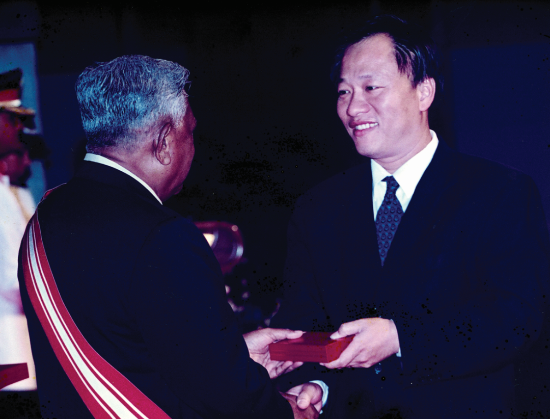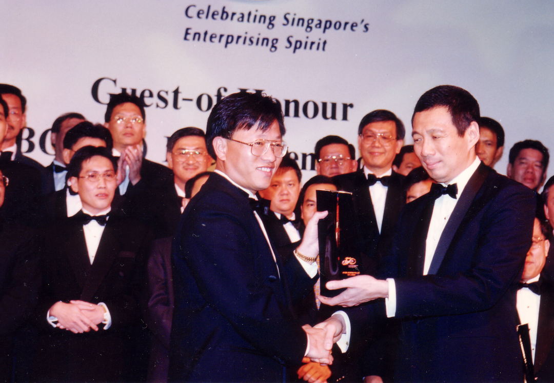 1996 年,新曄科技獲頒「新加坡50 家傑出企業獎」,由時任新加坡副總理李顯龍(右一)向吳木興(左一)頒獎