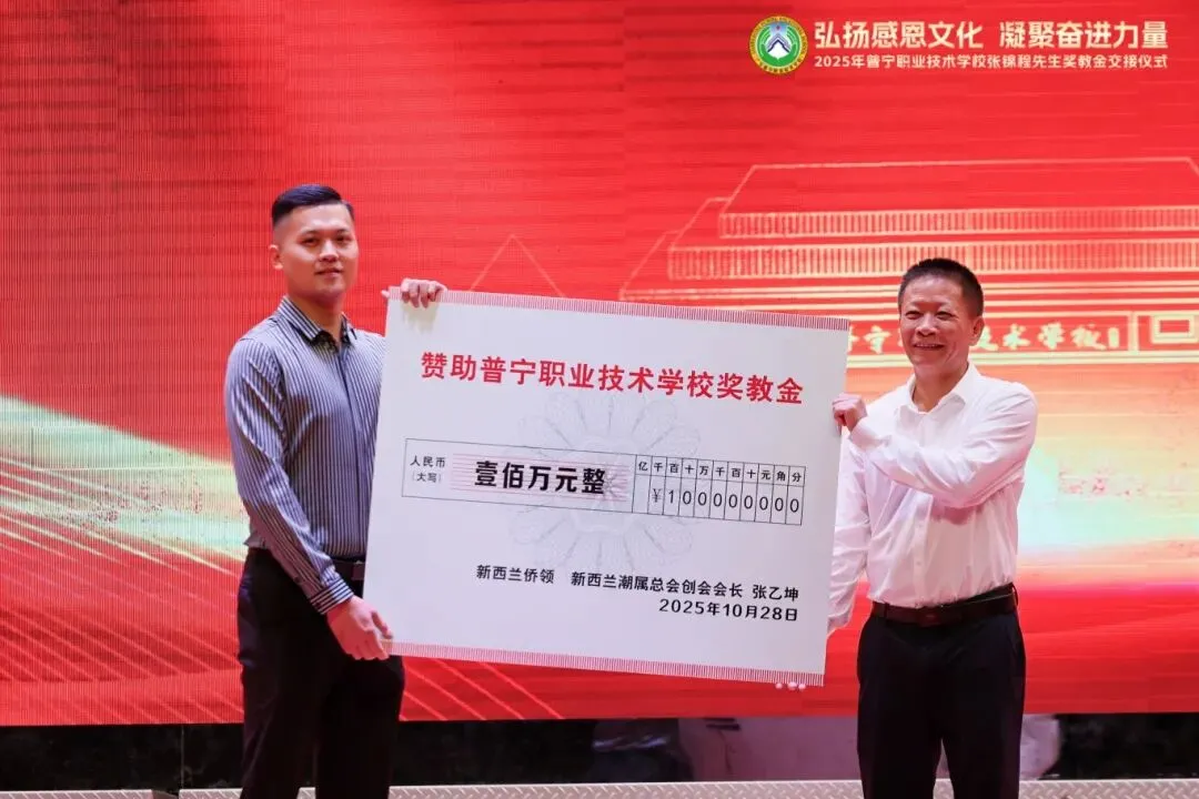 2025年10月28日,國際潮團總會執行主席、新西蘭潮屬總會創會會長張乙坤先生,再度向普寧職業技術學校捐贈100萬元,以實際行動助力家鄉教育事業的發展,用善舉書寫僑胞擔當。
