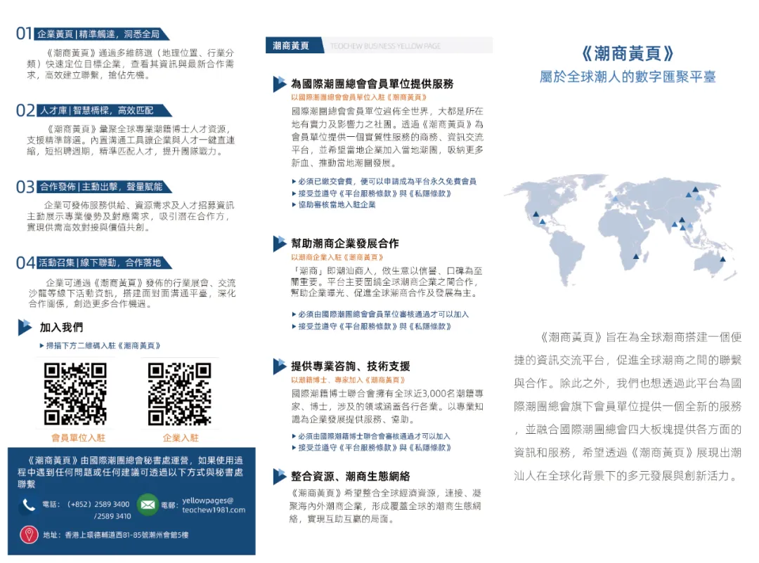 《潮商黃頁》四大功能 一、企業黄頁|精準觸達,洞悉全局 《潮商黄頁》通過多維篩選(地理位置、行業分類)快速定位目標企業,查看其资讯與最新合作需求,高效建立聯繫,搶佔先機。 二、人才智庫|智慧橋樑,高效匹配 《潮商黄頁》彙聚全球專業潮籍博士人才資源,支援精準篩選。内置溝通工具讓企業與人才一鍵直連,縮短招聘週期,精準匹配人才,提升團隊戰力。 三、合作發佈|主動出擊,聲量賦能 企業可發佈服務供給、资源需求及人才招募資訊,主動展示事業優势及對應需求,吸引潜在合作方,實現供需高效對接與價值共創。 四、活動召集|線下聯動,合作落地 企業可通過《潮商黄頁》發佈的行業展會、交流沙龍等線下活動資訊,搭建面對面溝通平臺,深化合作關係,創造更多合作機遇。