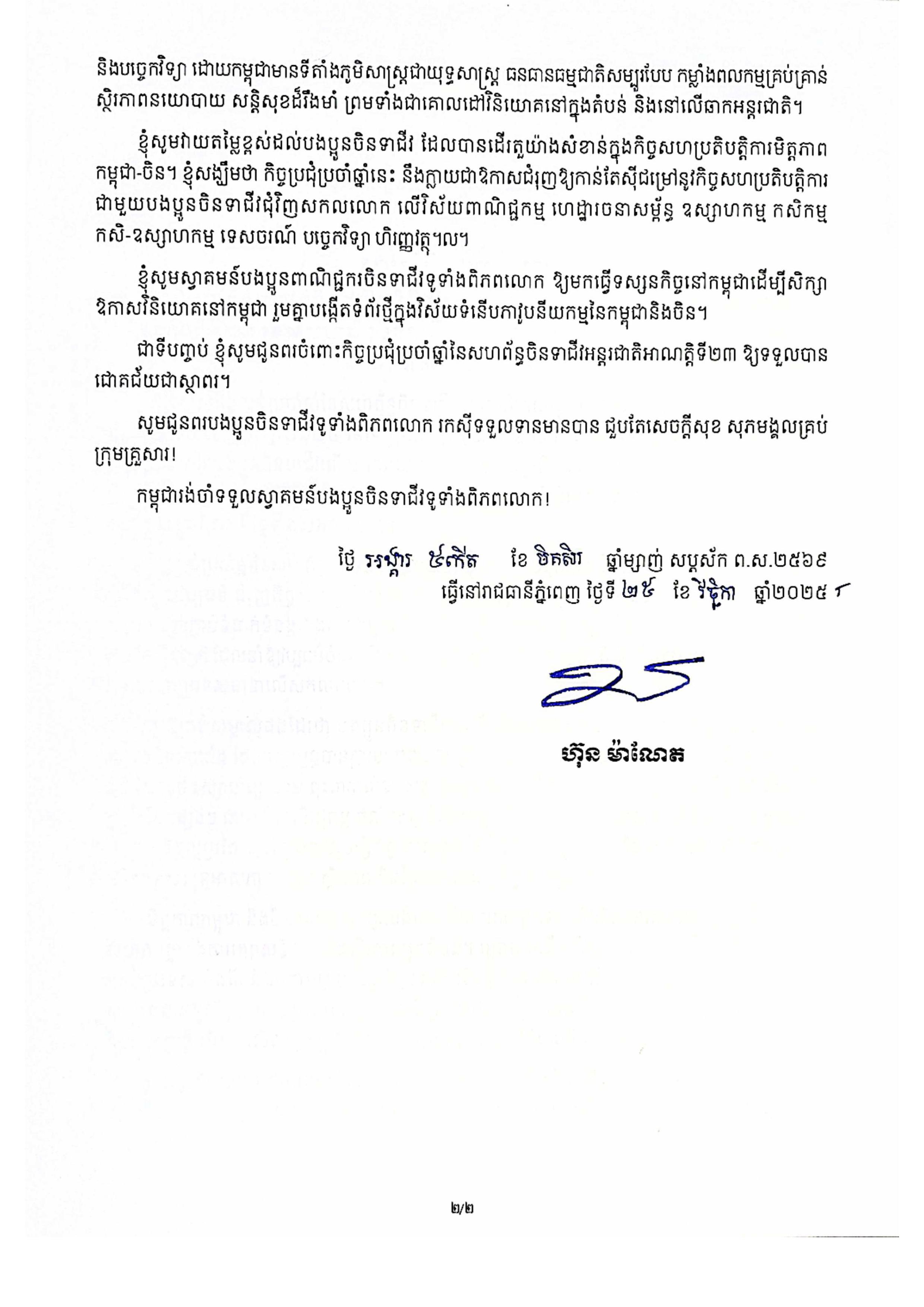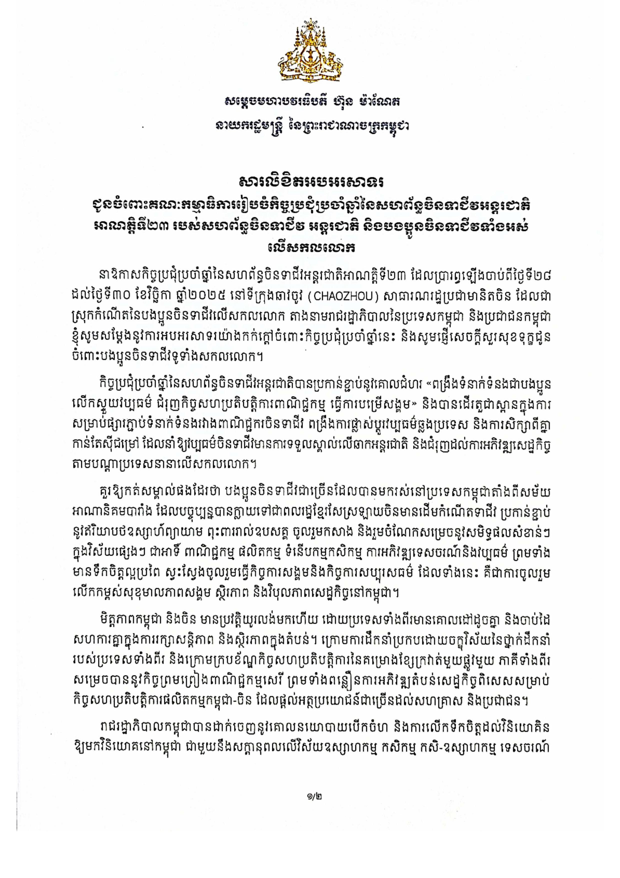 2025年11月28日至30日,以「根脈親 家國興」爲主題的第二十三屆國際潮團聯誼年會在潮州隆重舉辦,我們榮幸地收到柬埔寨王國首相洪瑪奈親王發來的賀信。作為中柬友好關系的堅定推動者,洪瑪奈首相始終高度重視華人華僑在促進多邊合作與人文交流中的橋梁作用,此次專門為第二十三屆國際潮團聯誼年會致賀,不僅體現了對全球潮團凝心聚力、共謀發展精神的肯定,更彰顯了中柬兩國「鐵桿友誼」在民間層面的深厚根基。 國際潮團聯誼年會作為連接全球潮人的重要紐帶,始終秉承「敦睦鄉誼、弘揚文化、促進工商、服務社會」的宗旨,在推動經貿合作、文化傳承與公益事業中發揮著不可替代的作用。歷屆年會期間,各國政要甚為重視,總統、總理或首相親臨主禮或題辭祝賀。洪瑪奈首相的賀信,既是對年會的肯定,也是對潮籍鄉親積極參與柬埔寨及東南亞地區建設的鼓勵與支持。