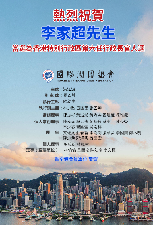李家超先生以1416票成功當選為第六任香港特別行政區行政長官人選,國際潮團總會致以最熱烈的祝賀。第六屆行政長官選舉依法依規,公平公正,是新選制下的選舉,對於香港未來「由治及興」、推動社會安定和融入國家發展規劃和粵港澳大灣區發展機遇具有重要意義。