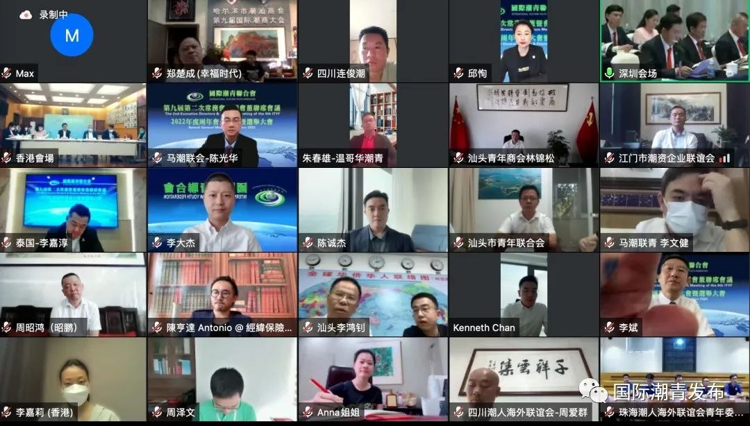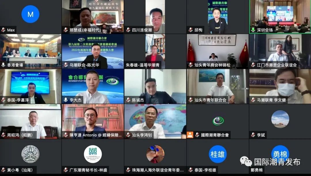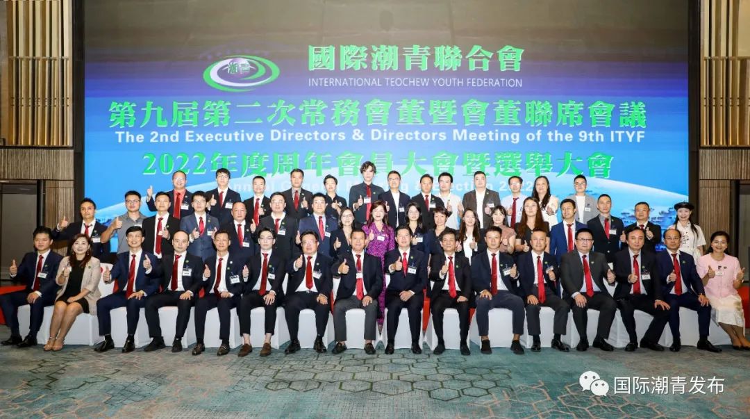 2022年9月16日,國際潮青聯合會第九屆第二次常務會董暨會董聯席會議、2022年度周年會員大會暨選舉大會順利召開。受全球疫情影響,大會採用現場會議+視頻連線的形式召開,在深圳設主會場,在港澳臺地区、泰國、馬來西亞、新加坡、加拿大、老撾、美國、英國、阿聯酋、澳洲以及內地部分城市設分會場。來自世界各地的潮籍青年精英、社團代表170多人參加大會,共商國際潮青創新發展大計。