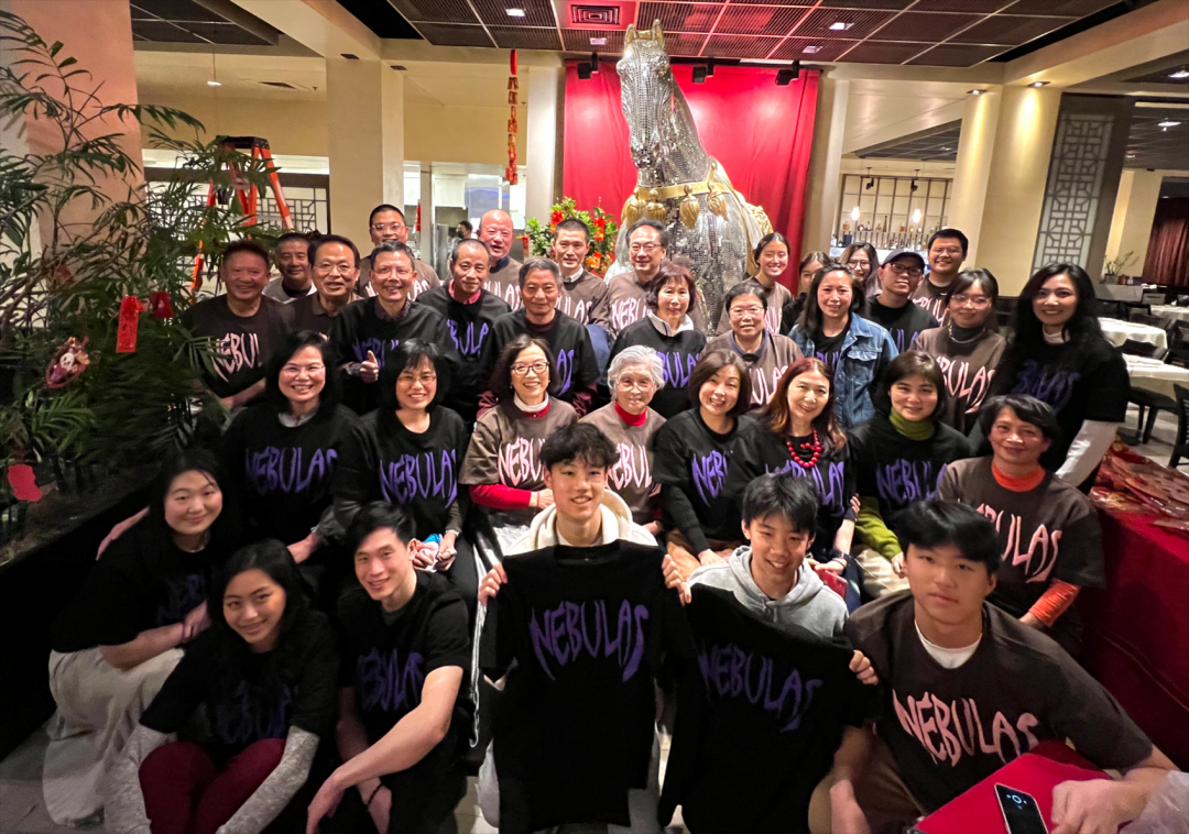 溫馨的新春宴會在⼤家舉杯慶祝,最後穿上 Tony 張設計的愛心慈善義賣 T 恤合影留念中圓滿結束。