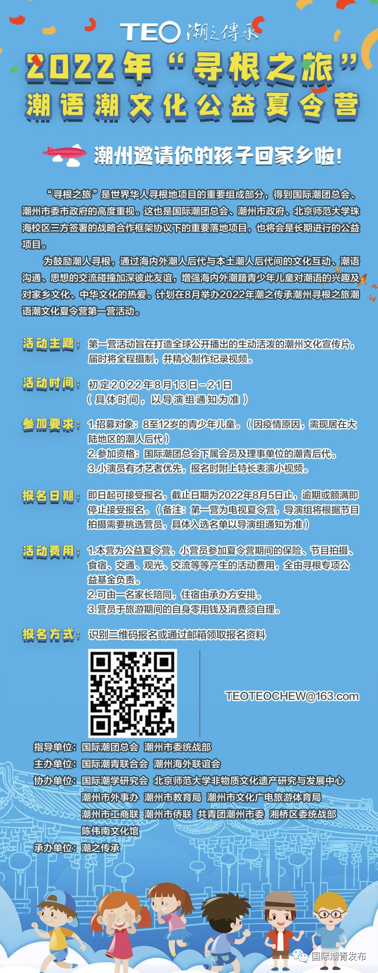 為鼓勵潮人尋根,通過海內外潮人後代與本土潮人後代間的文化互動、潮語溝通、思想的交流碰撞加深彼此友誼,增強海內外潮籍青少年兒童對潮語的興趣及對家鄉文化、中華文化的熱愛。由國際潮青聯合會作為主辦單位之一的2022年潮之傳承潮州尋根之旅潮語潮文化夏令營將於8月中旬在潮州古城舉辦,歡迎國際潮青大家庭裏的小朋友們踴躍報名。
