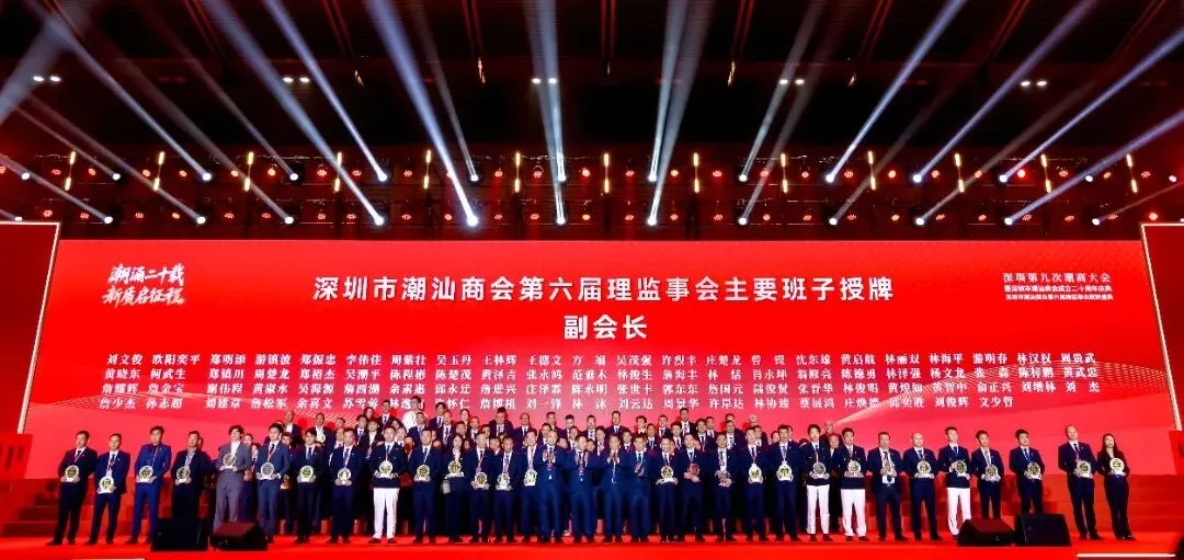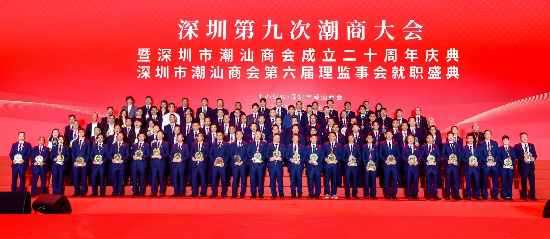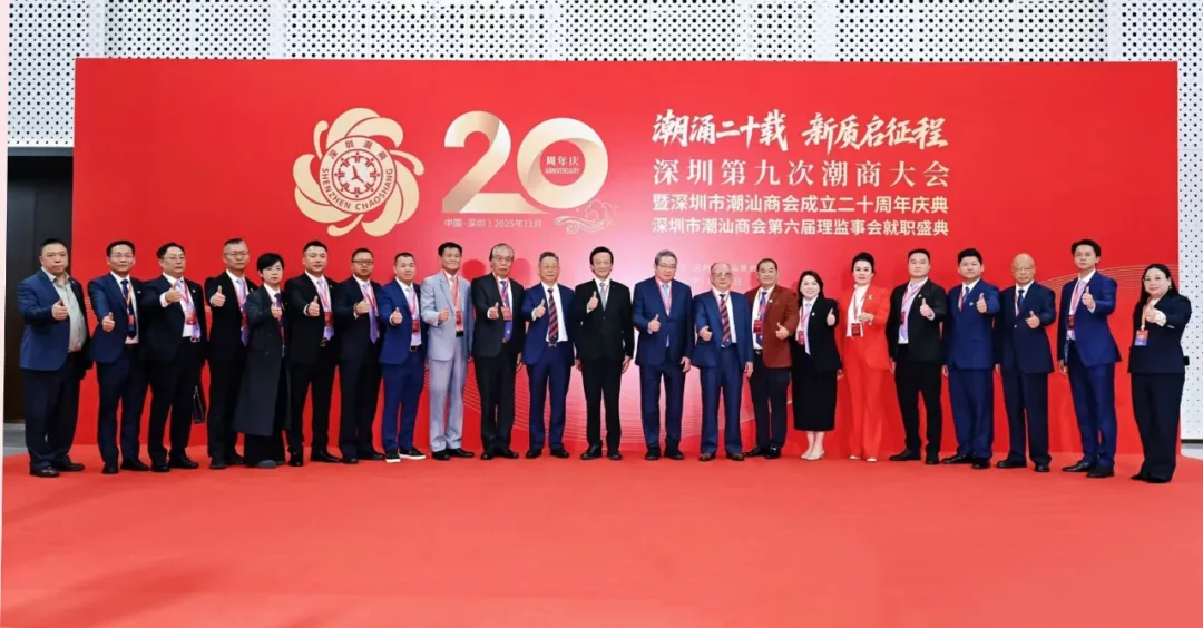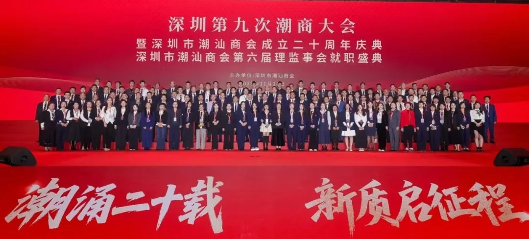 2025年11月26日,由深圳市潮汕商會主辦的深圳第九次潮商大會暨深圳市潮汕商會成立二十周年慶典、第六屆理監事會就職盛典在深圳福田會展中心隆重舉行。本次盛會以「潮湧二十載,新質啟征程」為主題,充分彰顯了潮商群體立足新時代、把握新機遇、譜寫新篇章的堅定決心。盛會恰逢於潮州市舉辦第二十三屆國際潮團聯誼年會前夕,來自全球20個國家和地區120個商協會代表團、潮人精英、政商名流及商會會員共1500人齊聚一堂,共敘鄉誼、共謀發展、共繪藍圖。大會同步開啟線上直播通道,全網累計觀看人次突破50萬,線上線下盡顯潮商群體的全球影響力。