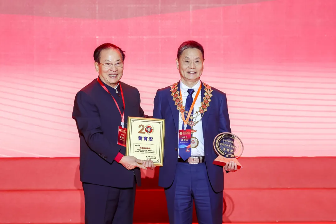 全國政協港澳臺僑委員會原副主任黃蘭發(右)為黃育宏(左)授予駐會會長牌匾