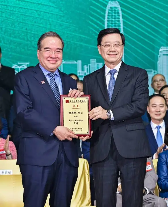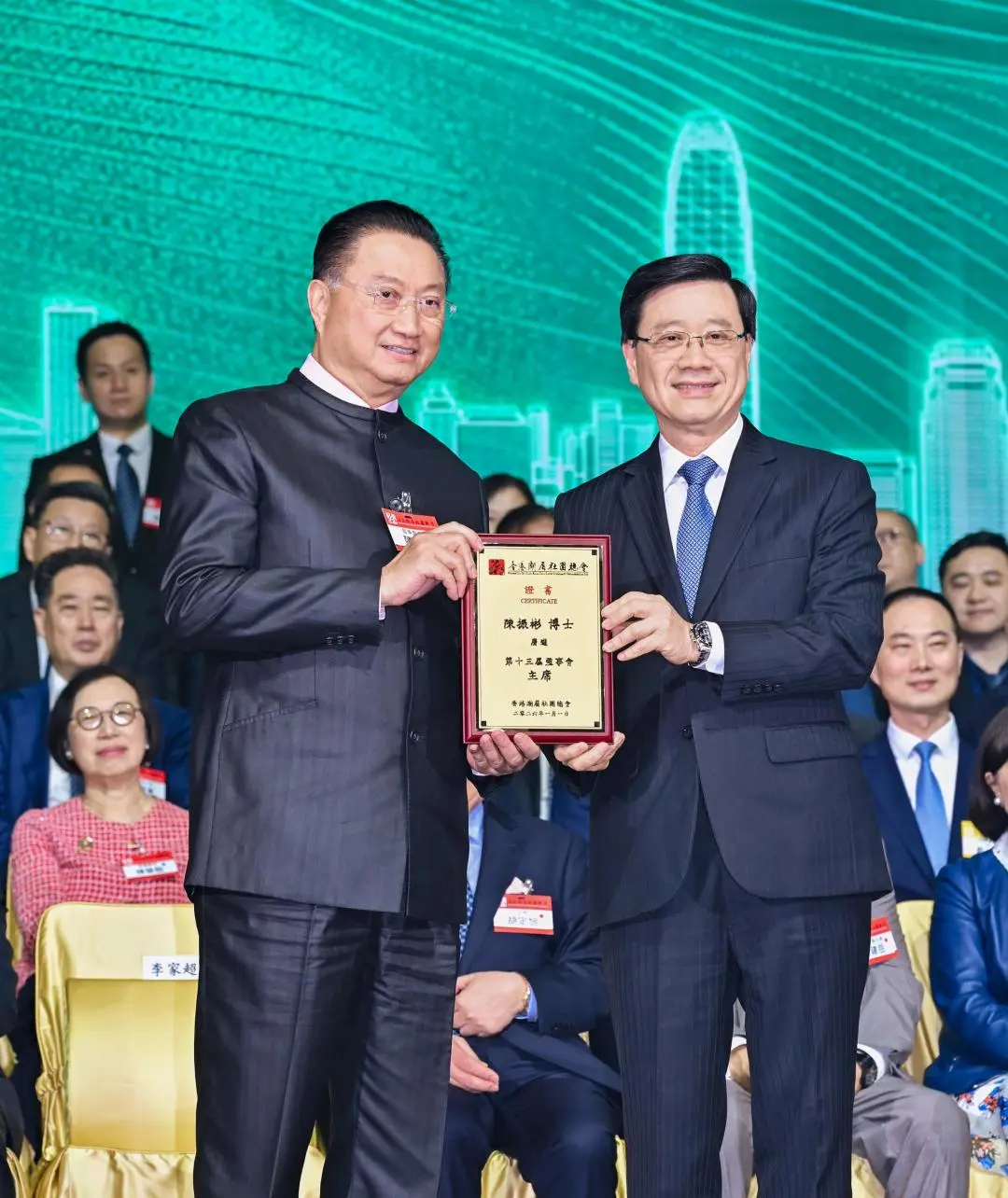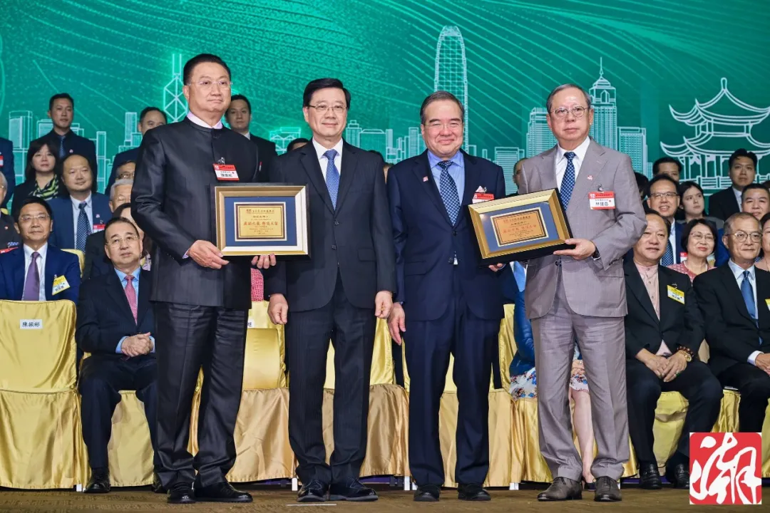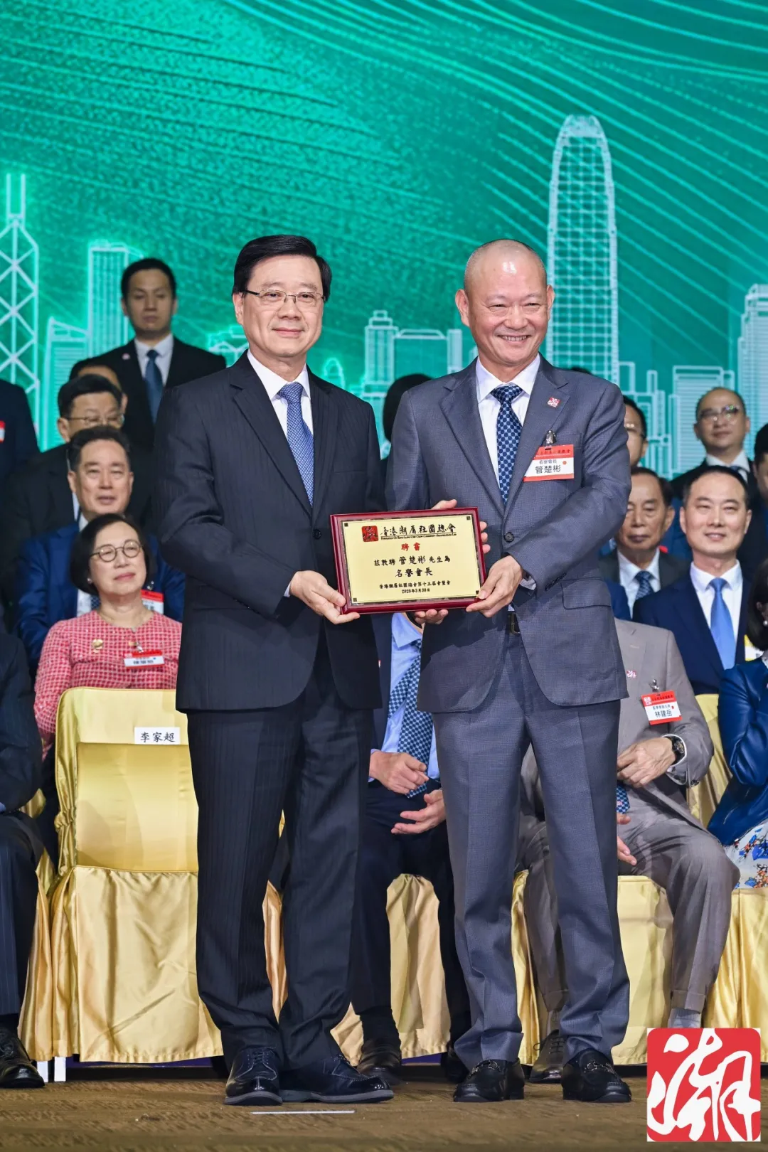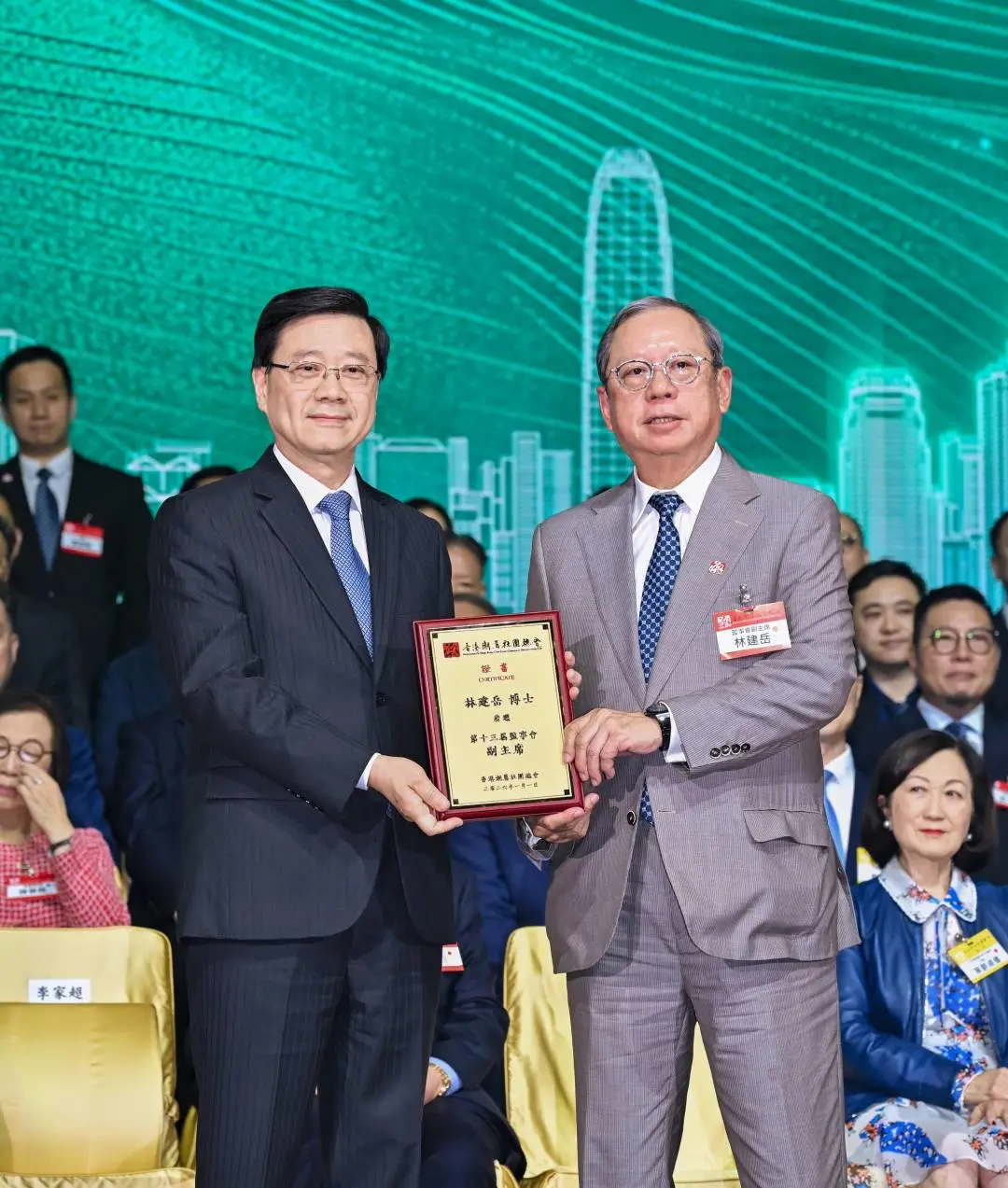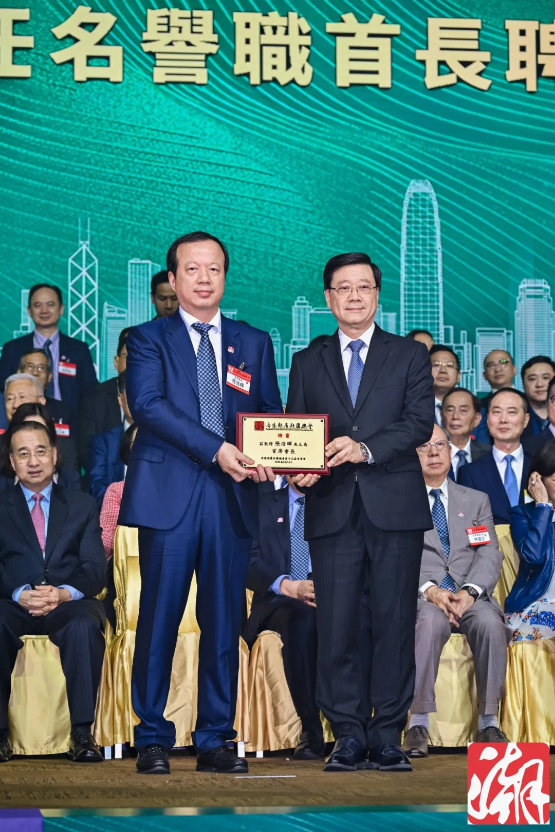 香港特別行政區行政長官李家超向首席會長張浩暉,名譽會長管楚彬頒發新聘任名譽職首長聘書。