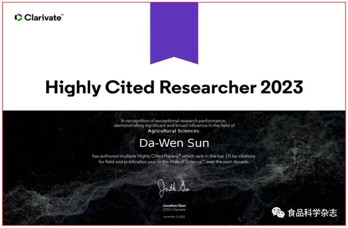 近日,科睿唯安(Clarivate Analytic)發佈最新數據,愛爾蘭皇家科學院院士、歐洲科學院院士、波蘭科學院外籍院士、國際食品科學院院士、國際農業與生物系統工程科學院院士、國際制冷科學院院士、2015-2022年ESI高被引學者、愛爾蘭國立都柏林大學(UCD)食品與生物系統工程教授、食品冷藏與電腦化食品技術研究中心主任孫大文院士(Da-Wen Sun)被評為「2023年高被引科學家」。